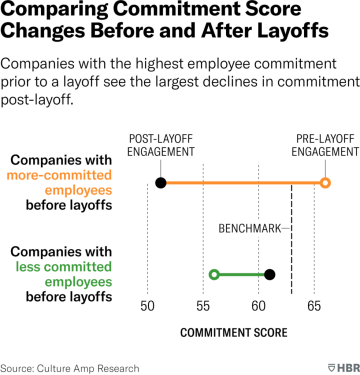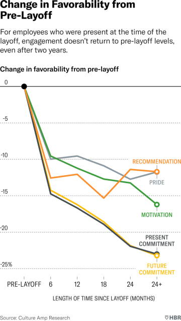 Studie, kterou publikovali Didier Elzinga a Amy Lavoie v Harvard Business Review, ukázala, že trvá minimálně šest měsíců, než se některé měřitelné aspekty angažovanosti zaměstnanců a jejich vztahu k vaší firmě přestanou propadat. Jejich výzkum na více než 146 společnostech, které propouštěly významné množství zaměstnanců mezi březnem 2020 a listopadem 2022, dokonce ukazuje, že na původní hodnoty se nevrátil žádný z měřených aspektů angažovanosti. Těmi myslíme chuť doporučovat společnost jako zaměstnavatele, nebo hrdost na svého zaměstnavatele, motivaci či dlouhodobý závazek vůči firmě. Dva posledně zmíněné aspekty dokonce nezačaly stoupat ani dva roky od propouštění. Jen se tempo jejich propadu v čase zpomalilo. Data dokonce naznačují, že čím angažovanější zaměstnance jste měli před hromadným propouštěním, tím větší propad jejich loajality můžete čekat po něm.