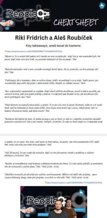 V rozhovoru s Alešem a Rikim zazněla velmi důležitá věc. Dovolím si ji trochu parafrázovat. Není důležité, jestli si vy myslíte, že jste manažer či leader. Důležité je, jak vás vidí ostatní. Jinými slovy, důvěru týmu a lidí obecně si nezískáte “titulem”, ale tím, co děláte a jak se chováte. Proto Aleš mluvil o tom, jak se v TopMonks do role COO vlastně mohl postavit sám. Začal tu práci dělat a spolu s výsledky jeho práce přicházela i důvěra ostatních. Riki taky dával užitečný tip. Pokud pracujete ve firmě, která není tolik holokratická jako TopMonks a jede na obvyklé struktury = o vaší přeměně na manažera rozhoduje váš šéf, první z čeho pozná, že jste zralí se stát šéfem nějaké skupiny lidí je, že za ním přestanete chodit s problémy a začnete chodit s řešeními. Chcete k tomu víc? Skvěle. Poslechněte si rozhovor mezi 16. a 22. minutou.